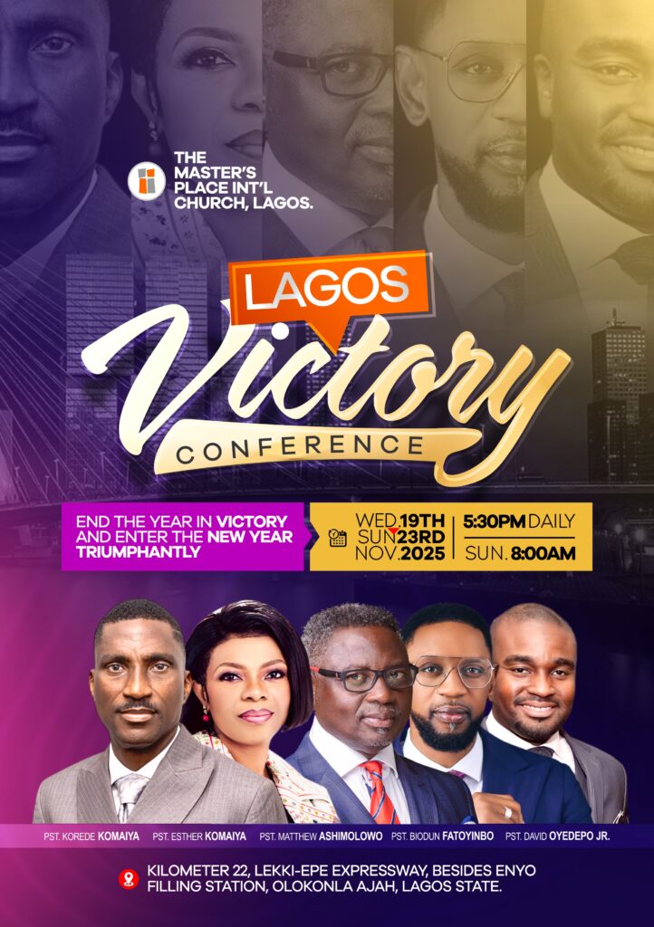 A divine wave is about to sweep through Lagos! The Lagos Victory Conference 2025, hosted by The Masters Place International Church Lagos, promises to be a life-defining encounter — a prophetic moment to wrap up 2025 in TOTAL VICTORY and cross into 2026 in ABSOLUTE VICTORY.