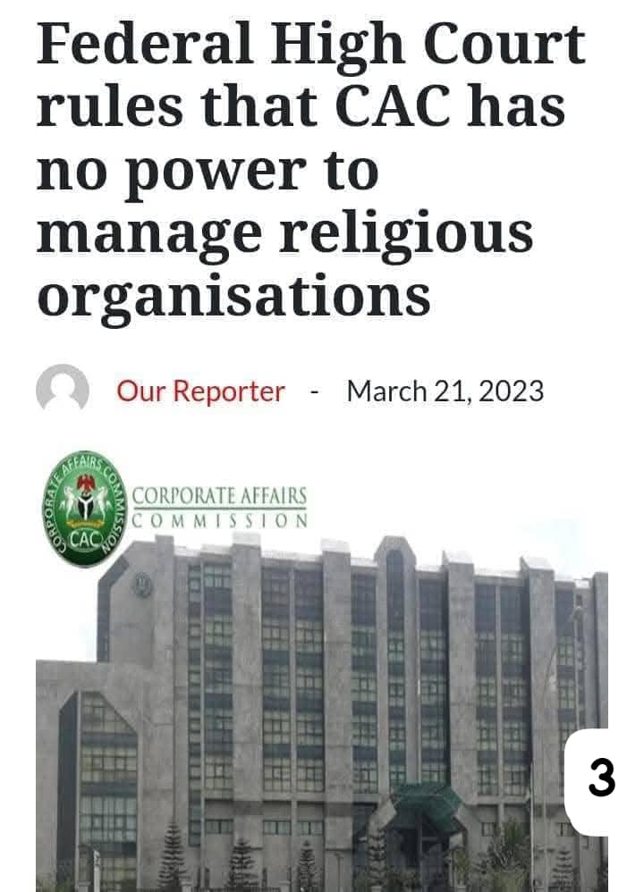 21st March 2023: The Federal High Court, Abuja presided by Justice Inyang Ekwo rules in favour of Christian Association of Nigeria (CAN) against Corporate Affairs Commission (CAC) making the provisions of Companies and Allied Matters Act (CAMA) 2020 which empowered CAC to, among other things, interfer and take over the administration of every Church in Nigeria (or even close them down) at the slightest allegation of non-compliance with certain provisions of CAMA 2020 inapplicable to Churches and Christian Bodies in Nigeria.